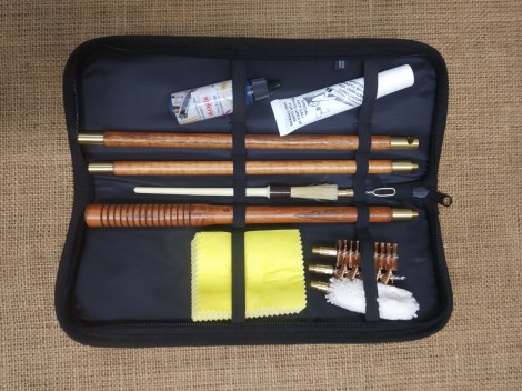 3 piece brass rod, bronze brush, wool mop, brass jag. Youngs 303 oil. Express oil, patches duster. Presented in a durable plastic box.